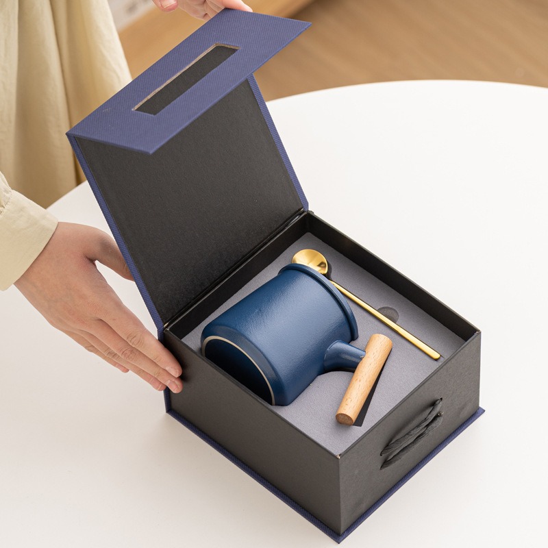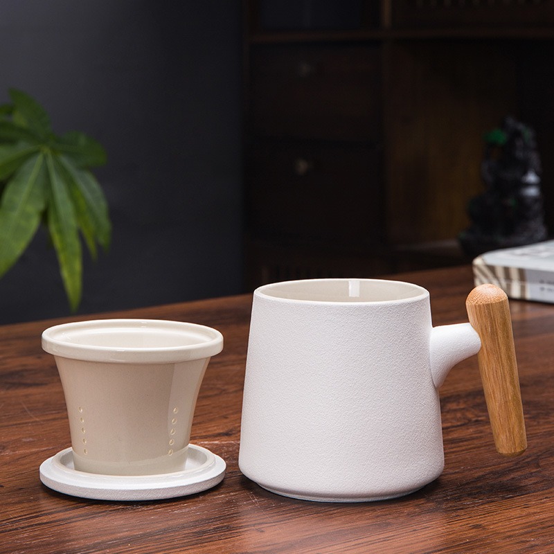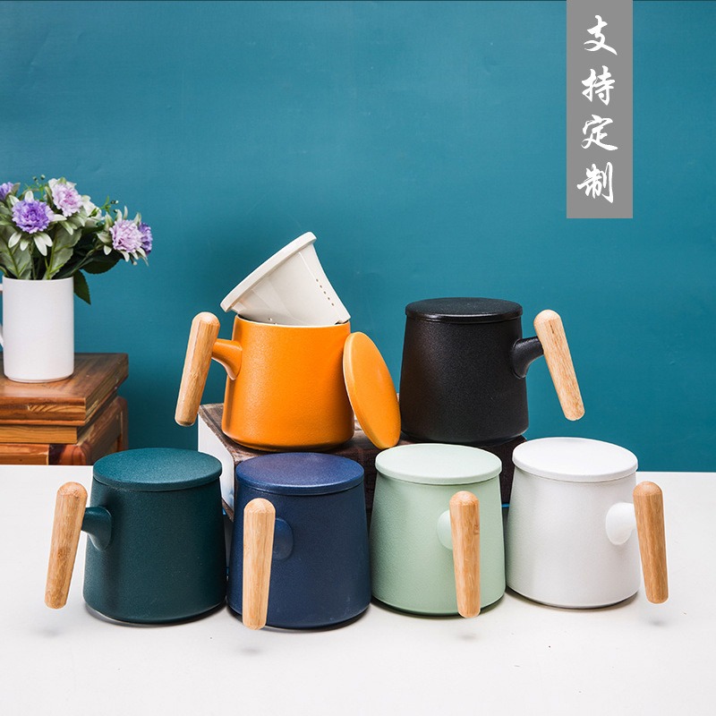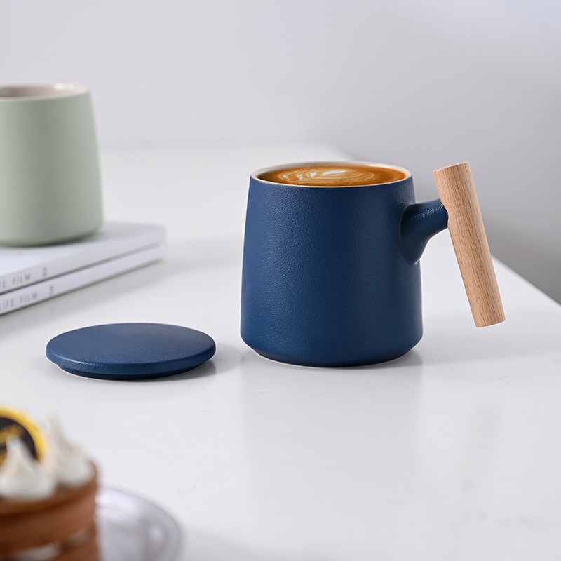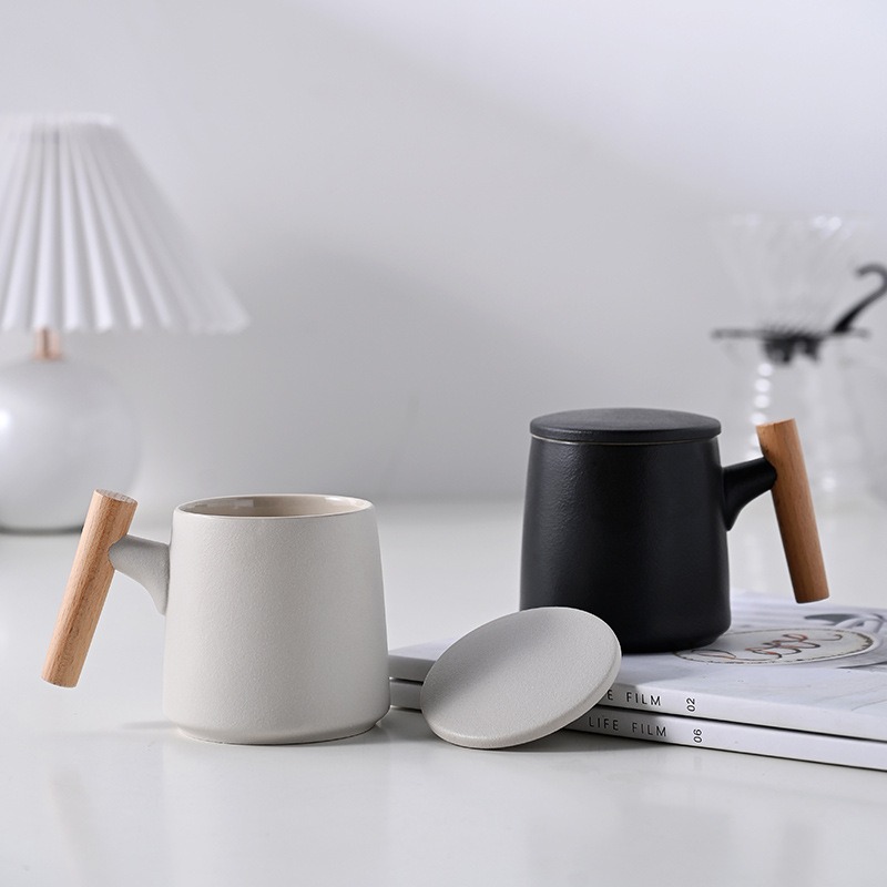 Gift Set แก้วน้ำเซรามิกสไตล์ญี่ปุ่นแบบเรียบ ด้ามไม้เคลือบ พร้อมฝา แก้วกาแฟสกรีนโลโก้ ทำเป็นของพรีเมี่ยม ของชำร่วย