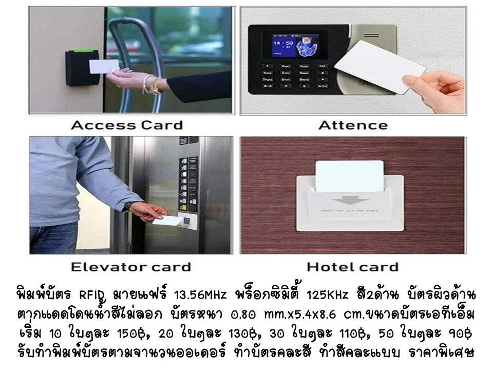 รับพิมพ์บัตรสมาร์ทการ์ด RFID ทำบัตรสมาชิกมายแฟร์ 13.56 MHz พิมพ์บัตรพร็อกซิมิตี้ 125 KHz การ์ดฝังชิปและเสาอากาศไว้ภายใน ทำให้สามารถระบุตัวตนและส่งข้อมูลไปยังเครื่องอ่านได้โดยไม่ต้องสัมผัส มีการใช้งานอย่างแพร่หลายสำหรับการควบคุมการเข้าออกอย่างปลอดภัย