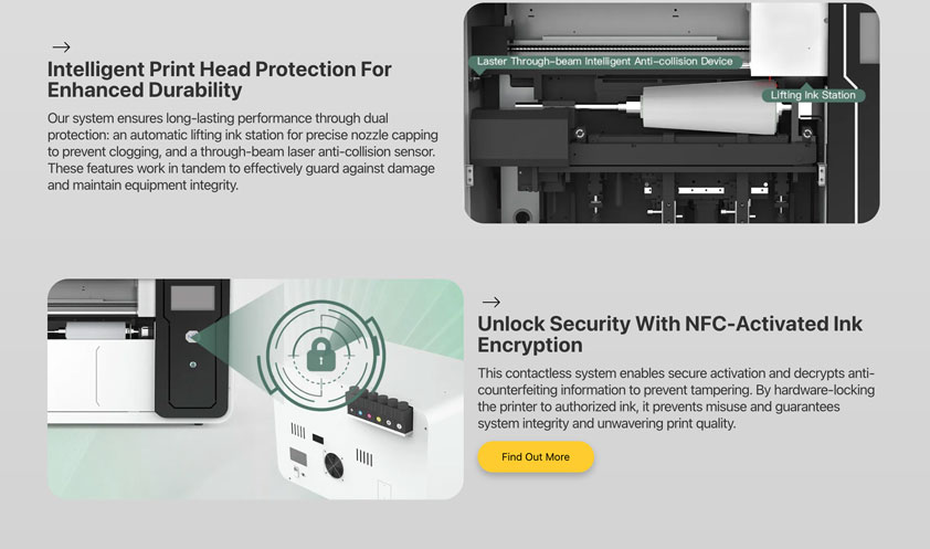 1. Intelligent Print Head Protection: ระบบป้องกันหัวพิมพ์กระแทกด้วยเซนเซอร์เลเซอร์ และระบบ Automatic Lifting Ink Station ที่ช่วยป้องกันหัวพิมพ์อุดตันเมื่อไม่ได้ใช้งาน