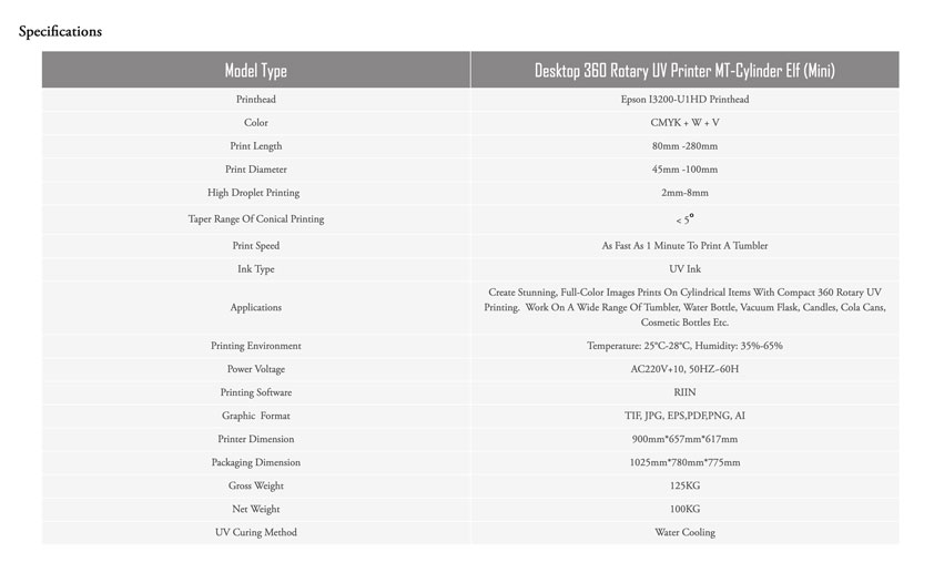 เครื่องพิมพ์ยูวี MT-Cylinder Elf (Mini) คือเครื่องพิมพ์ UV ระบบโรตารี่ขนาดตั้งโต๊ะ (Desktop Rotary UV Printer) ที่ย่อส่วนเทคโนโลยีระดับอุตสาหกรรมมาไว้ในตัวเครื่องขนาดกะทัดรัด แต่ยังคงประสิทธิภาพการพิมพ์ที่ทรงพลัง สามารถพิมพ์บนวัตถุทรงกระบอก ทรงกรวย และวัตถุที่มีรูปทรงซับซ้อนได้แบบรอบทิศทาง 360 องศา ด้วยคุณภาพสีที่สดใสและคมชัดสูงสุด
