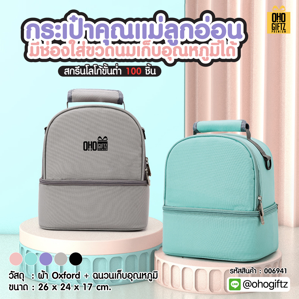 กระเป๋าคุณแม่ลูกอ่อน มีช่องใส่ขวดนมเก็บอุณหภูมิได้ สกรีนโลโก้ ทำเป็นของพรีเมี่ยม