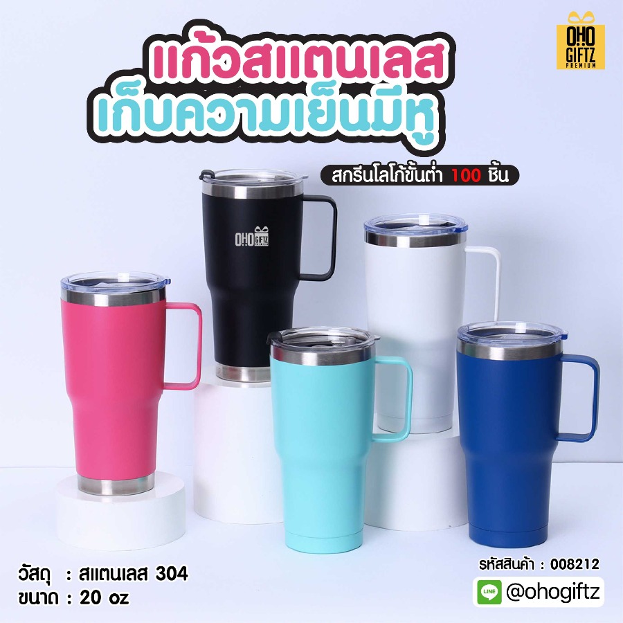 แก้วสแตนเลสเก็บความเย็นมีหู สกรีนโลโก้ ทำเป็นของพรีเมี่ยมได้