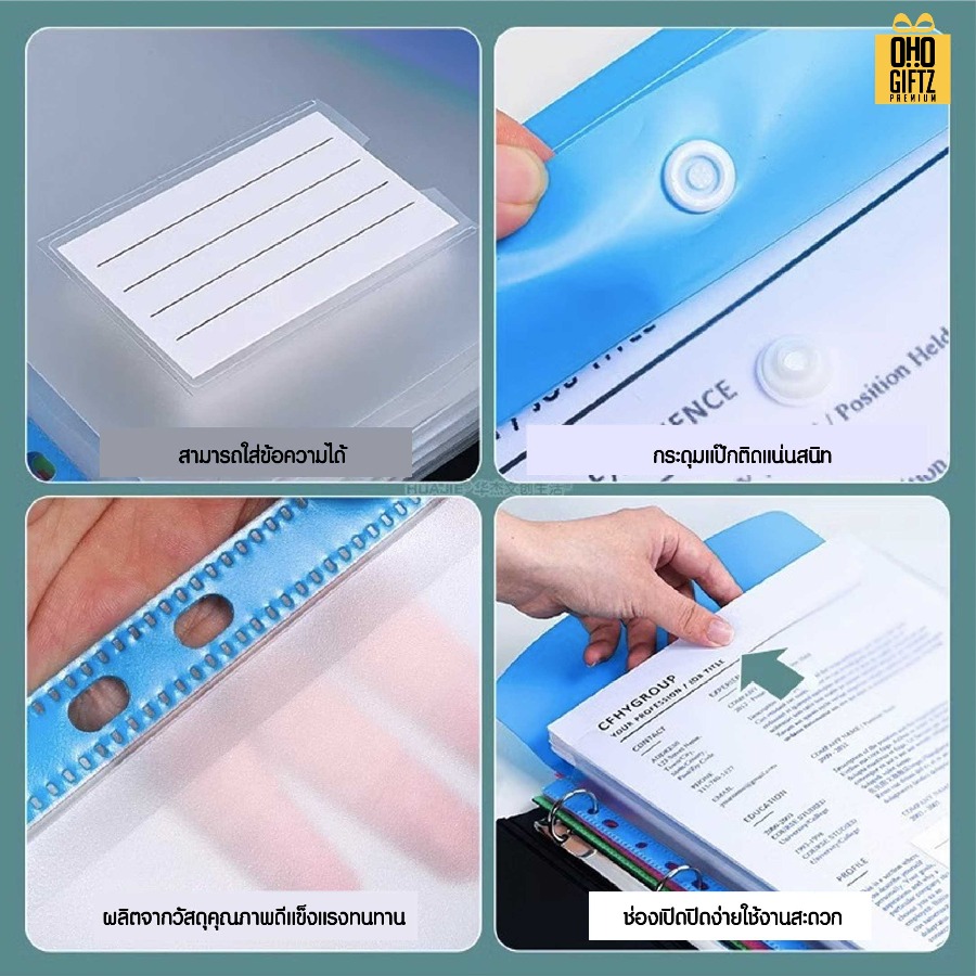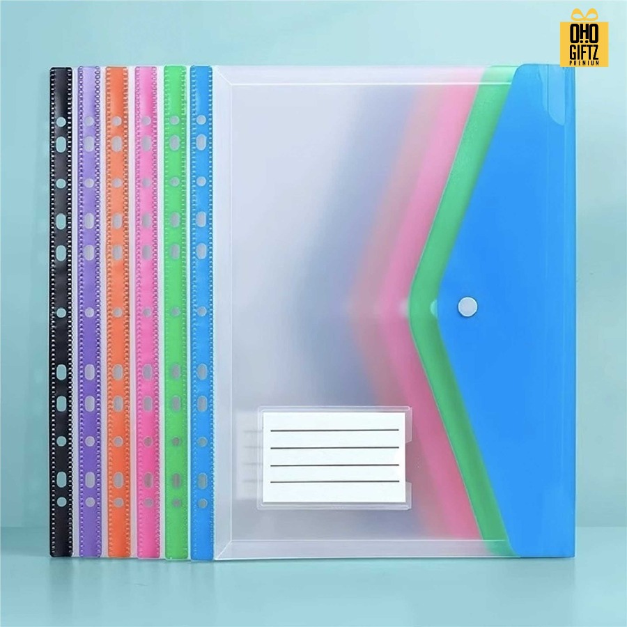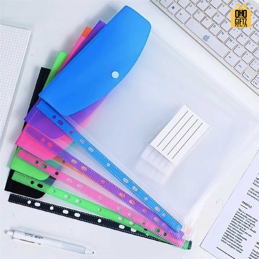 ซองพลาสติกใส่เอกสารแบบเจาะรูเข้าห่วง ดีไซน์มินิมอล สีสันสวยงาม เหมาะสำหรับใส่เอกสารต่างๆ ผลิตจากวัสดุคุณภาพดี ขนาดพอเหมาะมาพร้อมสายคล้องนุ่มนิ่ม น้ำหนักเบา พกพาสะดวก