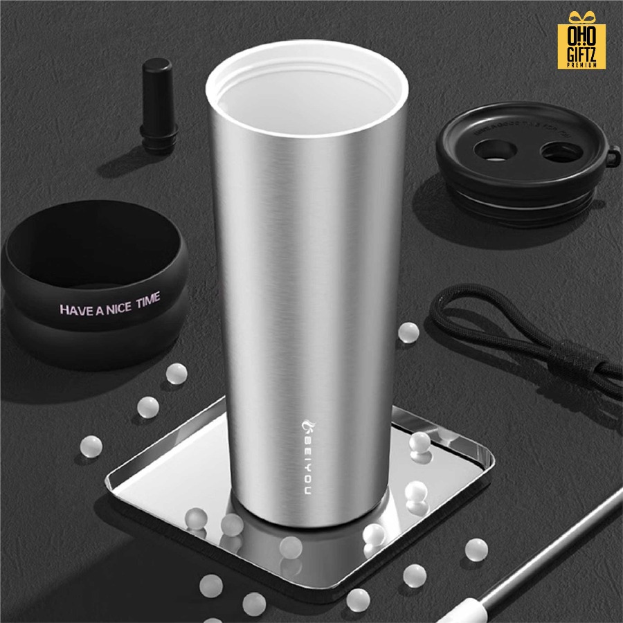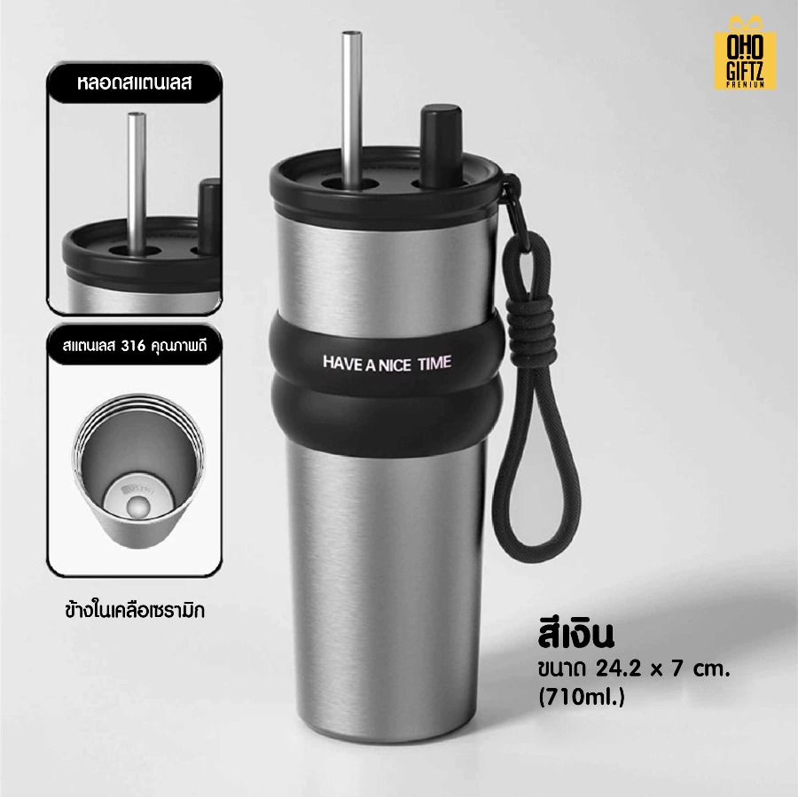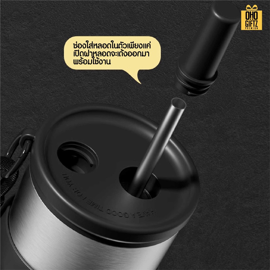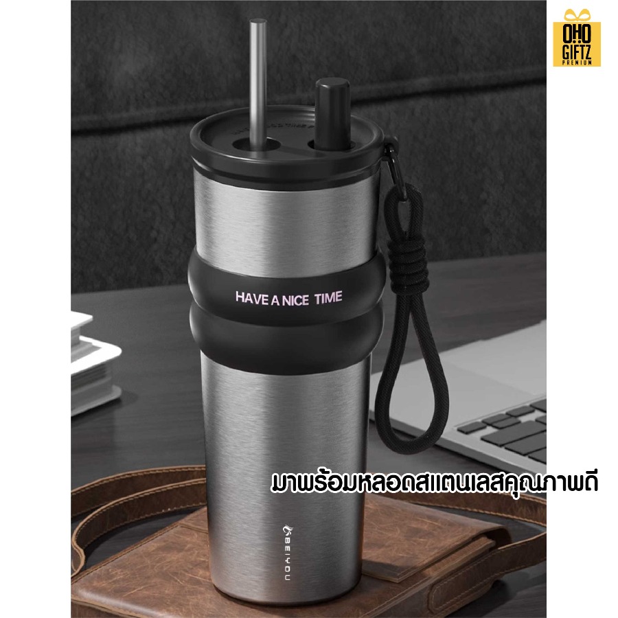 แก้วสแตนเลสทรงสูง มีสายคล้องมือ สกรีนโลโก้ ทำเป็นของพรีเมี่ยมได้