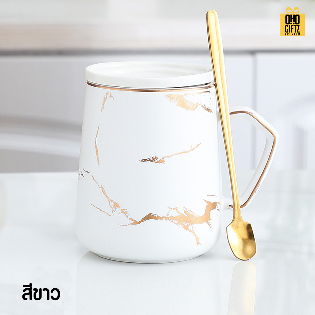 แก้วเซรามิคลายหินอ่อนริ้วทองพร้อมช้อนทอง สกรีนโลโก้ ทำเป็นของพรีเมี่ยมได้ (ขั้นต่ำ 100 ชิ้น)
