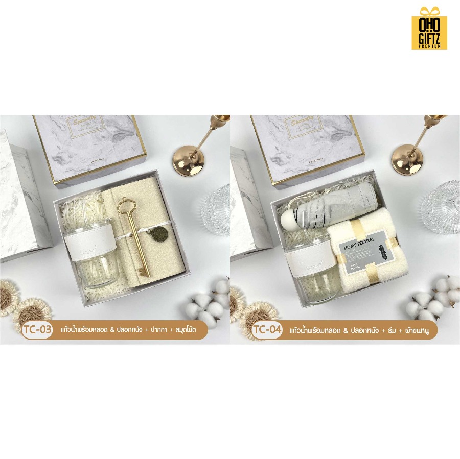 -9 Giftset ชุดของขวัญโทนสีขาวแก้วน้ำพร้อมหลอด & ปลอกหนัง+ร่ม