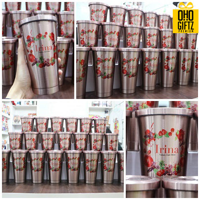 แก้วสแตนเลสเก็บความเย็นมีหู สกรีนโลโก้ ทำเป็นของพรีเมี่ยมได้