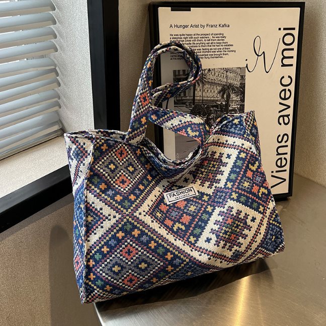 กระเป๋าผ้าใบนี้โดดเด่นด้วยลวดลายเรขาคณิตที่ทอด้วยสีสันหลากหลาย แต่ลงตัวบนพื้นผ้าโทนธรรมชาติ ช่วยเพิ่มความน่าสนใจให้กับดีไซน์ที่เรียบง่าย ตัวกระเป๋าทำจากผ้าเนื้อหนา แข็งแรง น้ำหนักกำลังดี พกพาสะดวก ใช้ใส่ของใช้ประจำวัน เอกสาร หรือเสื้อผ้าสำหรับวันสบาย ๆ ก็เหมาะ ด้วยทรงกระเป๋าที่กว้างและเปิดใช้งานง่าย จึงตอบโจทย์ทั้งเรื่องดีไซน์และการใช้งานในชีวิตประจำวัน