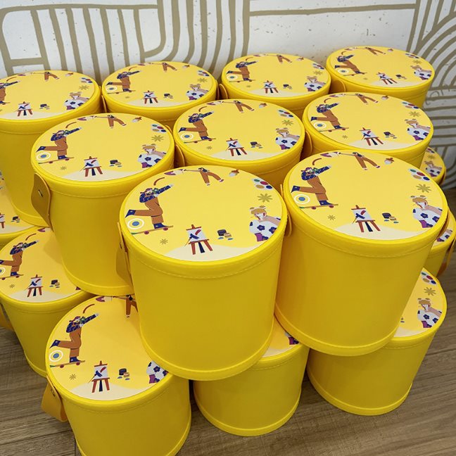 กล่องทรงกลมดีไซน์น่ารัก พร้อมหูหิ้วใช้งานสะดวก ตัวกล่องผลิตจากวัสดุแข็งแรง ทนทาน ตกแต่งฝาด้วยลวดลายกราฟิกสีสันสดใส เพิ่มความน่าสนใจ เหมาะสำหรับใส่ขนม ของขวัญ หรือของใช้ต่าง ๆ ในโอกาสพิเศษได้อย่างลงตัว