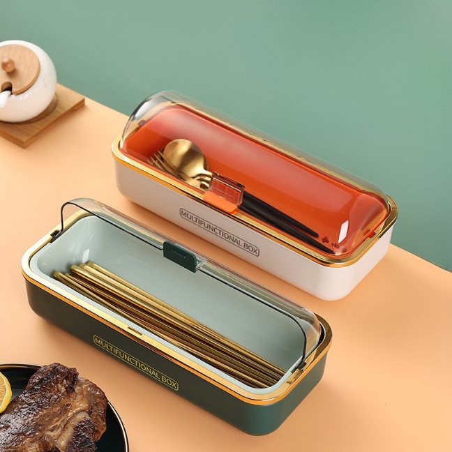 กล่องเก็บช้อนส้อมรุ่นนี้ออกแบบมาให้ใช้งานง่ายและสะดวก ตัวกล่องมีฝาครอบใสช่วยป้องกันฝุ่นละอองและแมลง พร้อมดีไซน์ฝาเปิดปิดด้วยมือเดียว วัสดุแข็งแรงทนทาน ตกแต่งขอบสีทองเพิ่มความหรูหรา เหมาะสำหรับวางในห้องครัว ห้องอาหาร หรือมุมทานข้าว ช่วยให้ช้อนส้อมและตะเกียบเป็นระเบียบมากขึ้น