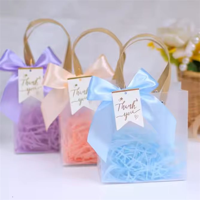 สร้างความทรงจำอันแสนพิเศษตั้งแต่แรกเห็นด้วยถุงสำหรับใส่ของขวัญที่ออกแบบมาอย่างใส่ใจ ตัวถุงมีให้เลือกทั้งแบบพลาสติกโปร่งแสงที่มองเห็นของขวัญด้านในได้อย่างสวยงาม มาพร้อมหูหิ้วที่แข็งแรงและมีเอกลักษณ์ โดดเด่นที่สุดด้วยการประดับโบว์ผ้าซาตินขนาดใหญ่ที่ผูกไว้อย่างงดงามด้านหน้า ซึ่งเป็นรายละเอียดที่ช่วยยกระดับของขวัญธรรมดาให้ดูพิเศษยิ่งขึ้น