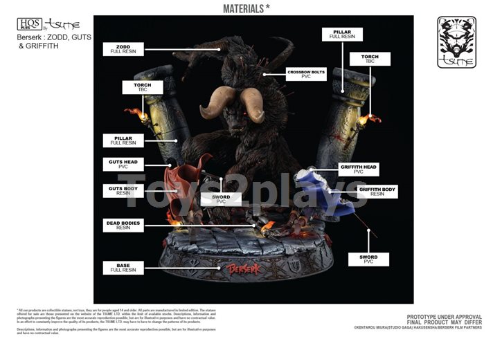 On a technical side, this statue is setting the next pinnacle of what Tsume® can do. Sculpture is both very detailed and true to the anime, especially Zodd’s fur and the three characters’ expressions. The background offers various points of interests, such as the base who mimics ancient wall sculptures and offers a unique Behelit-adorned fresco telling the story of Berserk. Our LED lighting system allows us to offer both warms with the flames of the torches, and life through Zodd’s blazing gaze. Of course, the colouring job is stunning and embodies perfectly the gritty and gory mood of Miura Kentaro’s masterpiece. Last but not least, both Griffith and Guts come with two heads, so you can choose how to display each of them: with or without his helmet.