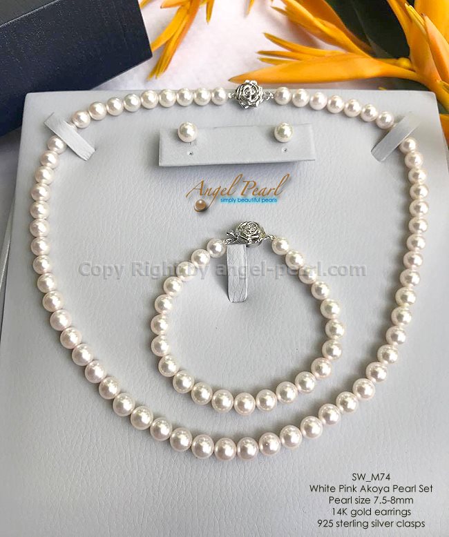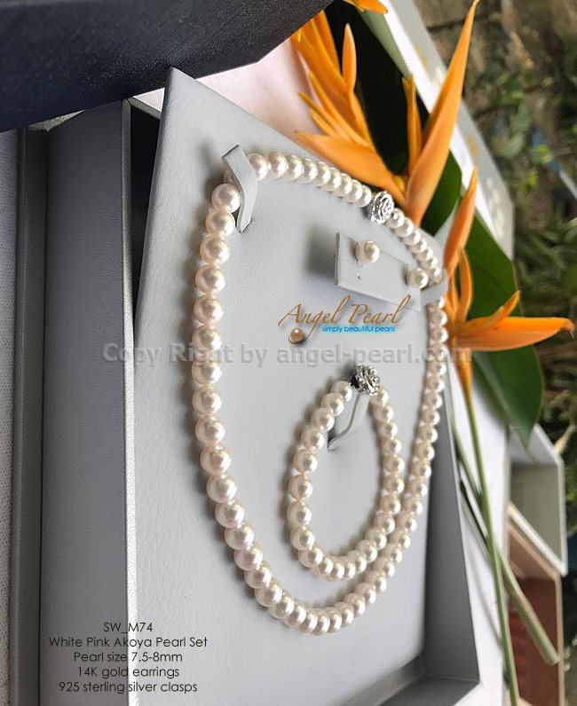 ชุดไข่มุกน้ำเค็มแท้ Akoya มุกสีขาวอมชมพูอ่อน น้ำงาม ทุกทรงกลมสนิททุกเม็ด และมีความเงางามสูง แทบไม่มีรอยธรรมชาติเลย