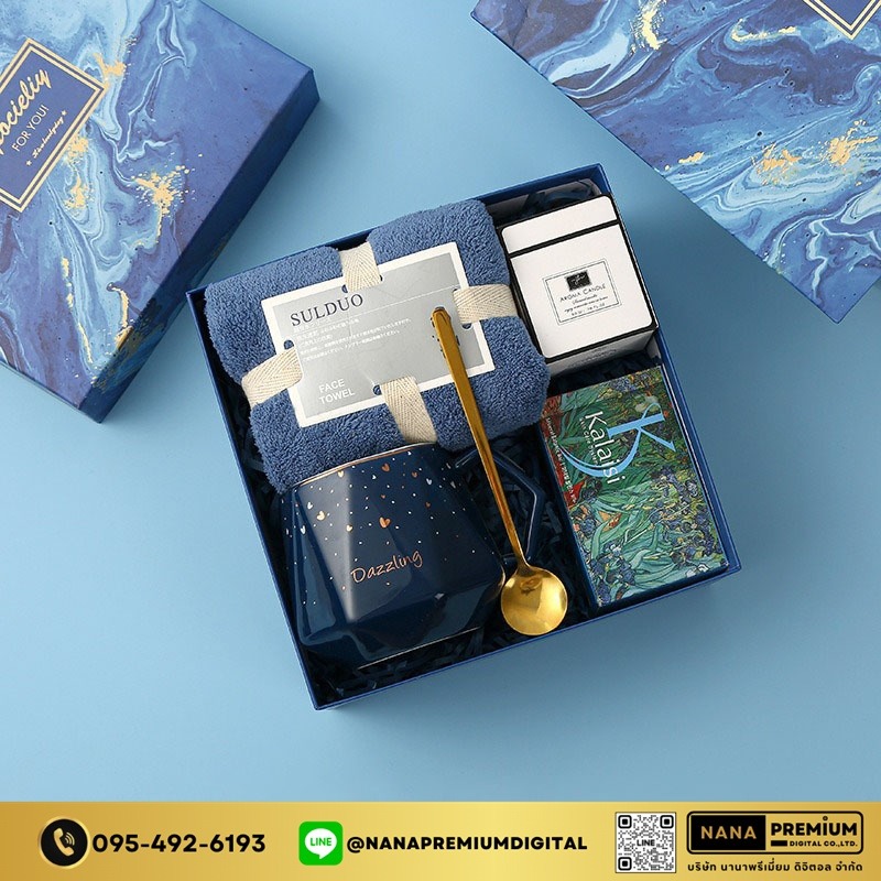 ชุดของขวัญ ของแจกสีน้ำเงินกรม ชุดเซ็ทรับไหว้ ชุดเช็ทผ้าเช็ดตัว+แก้วกาแฟ นมร้อน น้ำผลไม้ เครื่องหนัง