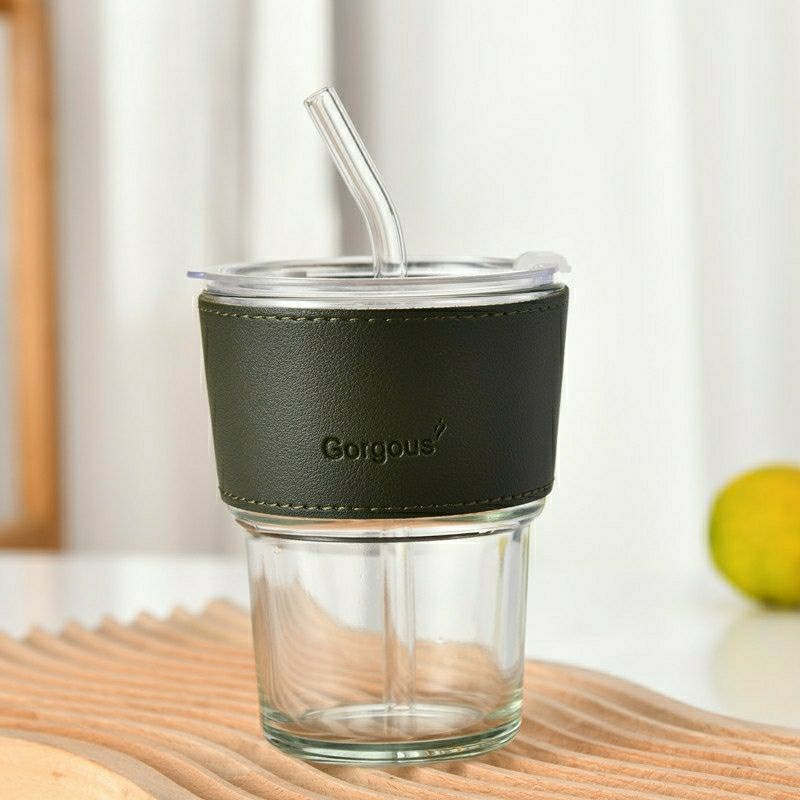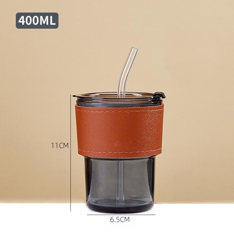 ถ้วยแก้ว แก้วใส่น้ำ 400ml แก้วกาแฟ สไตล์มินิมอล พร้อมหลอดแก้ว ฝาปิด ปลอกหนังกันร้อนกันเย็น