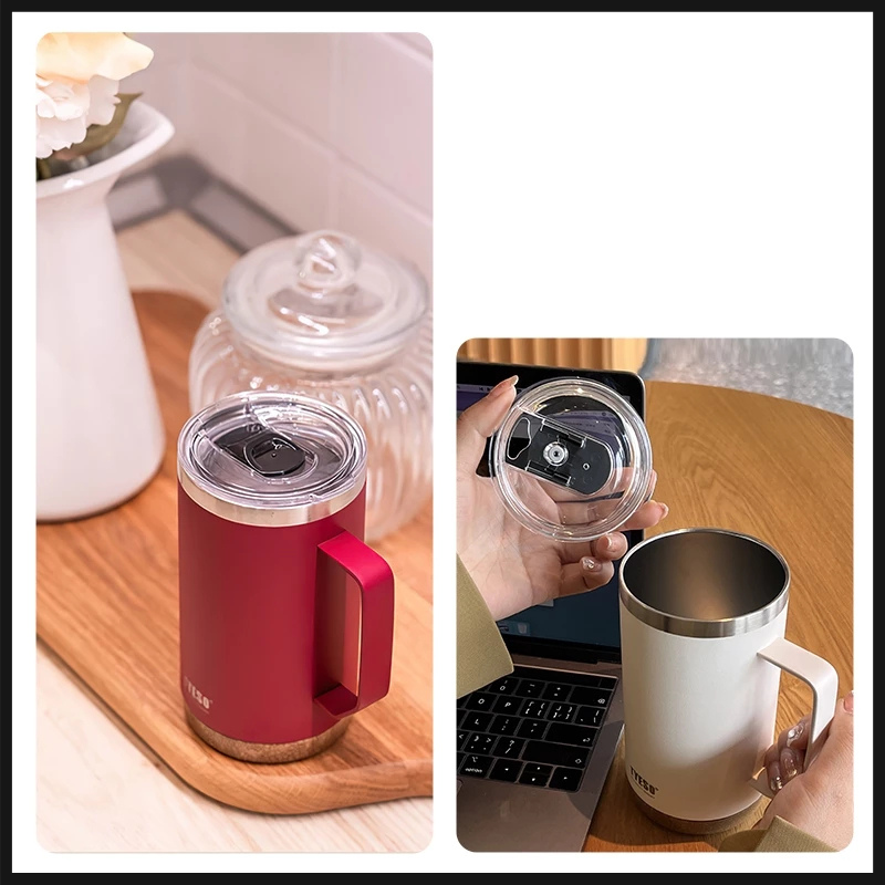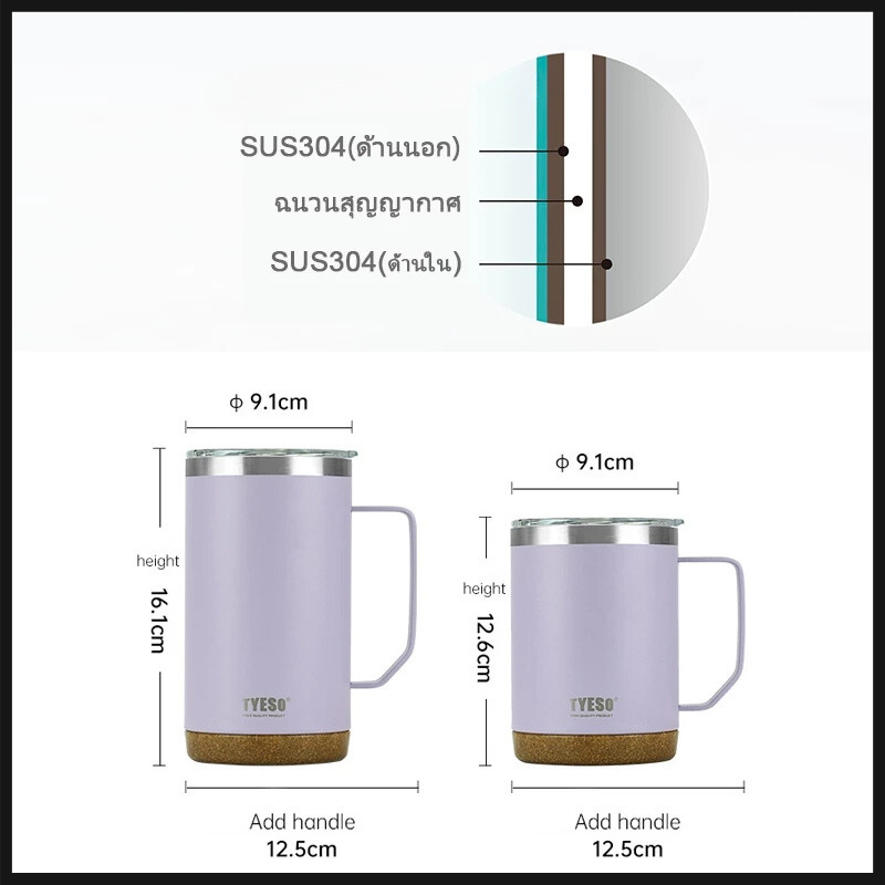 TYESO แก้วน้ำเก็บอุณหภูมิ มีหูจับ ฐานไม้โอ๊คเคลือบเงา แก้วกาแฟ แก้วเก็บความร้อน