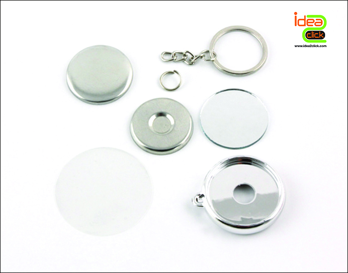 พวงกุญแจทรงกลม อีกด้านหนึ่งเป็นกระจกส่องหน้าได้ ทำด้วยเครื่องทำเข็มกลัด