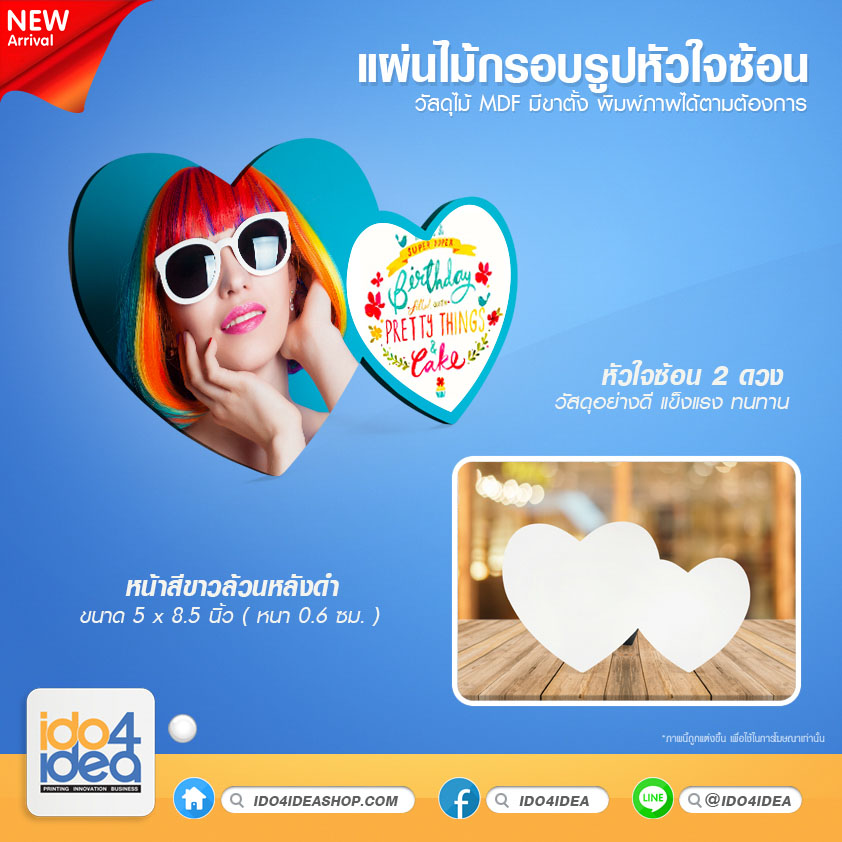 [1100MDFP00] กรอบรูปไม้แผ่นไม้สำหรับงานสกรีน แผ่นไม้ MDF กรอบรูปหัวใจซ้อน 2 ดวง มีขาตั้ง ขนาด 5 x 8.5 นิ้ว