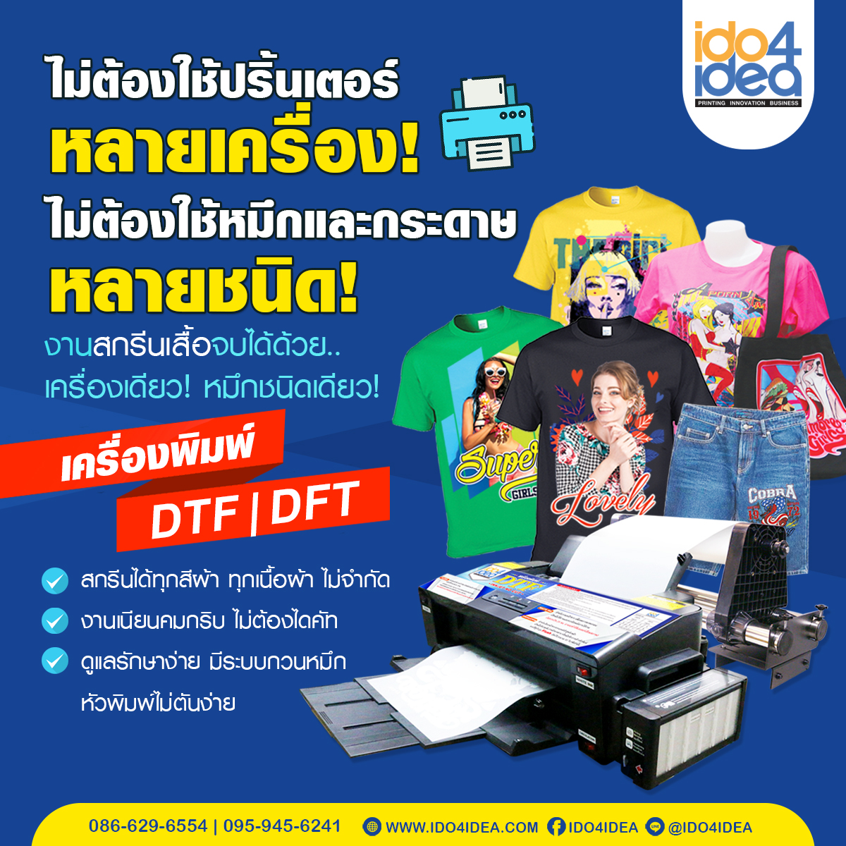 บทความ งานสกรีนเสื้อDTF/DFT จบด้วยเครื่องเดียว สกรีนเสื้อได้ทุกสี งานสกรีนเสื้อDTF/DFT จบด้วยเครื่องเดียว สกรีนเสื้อได้ทุกสี รายละเอียดบทความ วันที่โพส : 16/12/2022 จำนวนคนเข้าชม : 2676 " งานสกรีนเสื้อ จบด้วยเครื่องเดียว! " ไม่ต้องใช้ปริ้นเตอร์หลายเครื่อง ไม่ต้องมีหมึกหลายชนิด! กับเครื่องพิมพ์ DTF จบ! สกรีนเสื้อได้ทุกสี! ทุกเนื้อผ้า! ไม่ต้องเปิดบล็อก! งานพิมพ์เสื้อแบบ DTF/DFT ดีอย่างไร ไม่ต้องเปิดบล็อก ไม่ต้องไดคัท ไม่จำกัดทำได้ทุกเนื้อผ้า ได้ทั้ง COTTON 100%, TK, TC ได้ทั้งผ้าสีเข้มและสีอ่อน ติดแน่นเรียบเนียนไปกับเนื้อผ้า ต้นทุนถูกสุดๆ ดูแลรักษาง่าย สีสดภาพคมชัด ทนทานต่อการซัก สกรีนเสื้อแบบ DTF หรือ DFT พระเอกของวงการพิมพ์เสื้อ เครื่องพิมพ์สกรีนเสื้อด้วยแผ่นฟิล์มทรานเฟอร์ ด้วยเครื่องพิมพ์ Inkjet หมึกประเภท Pigment Ink สะดวก ดูแลง่าย งานคมชัด ไม่ต้องมีบล็อก ไม่ต้องมีเครื่องไดคัท NO CUT สกรีนเสื้อตัวเดียวก็สามารถทำได้ รองรับทุกเนื้อผ้า ไม่ว่าจะเป็นเสื้อยืดผ้าคอตต้อน Cotton 100 %, TC, TK, ผ้าใยสังเคราะห์, Polyester, ผ้า Nylon, ผ้าลินิน, ผ้าซาติน Satin และผ้าชนิดอื่นๆ อีกมากมาย ไอดูโฟร์ไอเดีย มีเครื่องพิมพ์ DTF หรือ DFT จำหน่ายหลากหลายรุ่นดังนี้ เริ่มตั้งแต่รุ่น Besic ขนาดหน้ากว้าง A4 และ A3 ต่อด้วยเครื่องพิมพ์ DTF DFT พร้อมเครื่องอบแผ่น DTF เครื่องสกรีนเสื้อ DTF DFT พร้อมเครื่องรีดร้อน เครื่องสกรีนเสื้อ DTF DFT รองรับงานพิมพ์แบบม้วนฟิล์ม พร้อมเครื่องอบ โรยกาว เครื่องสกรีนเสื้อ DTF DFT รุ่น 2 หัวพิมพ์ หน้ากว้างตั้งแต่ 30 cm. ไปจนถึง 60 cm. รองรับงานพิมพ์แบบม้วนฟิล์ม พร้อมเครื่องอบ โรยกาว รายละเอียดเครื่อง DTF DFT รุ่น 2 หัวพิมพ์หน้ากว้าง 30 CM. >> CLICK รายละเอียดเครื่อง DTF DFT รุ่น 2 หัวพิมพ์หน้ากว้าง 60 CM. >> CLICK VDO แนะนำเครื่องสกรีนแบบ DTF / DFT VDO แนะนำเครื่องสกรีนแบบ DTF / DFT รุ่นหน้ากว้าง แบบ 60 cm. ถูกใจบทความนี้ ช่วยกดไลค์หรือแชร์กันหน่อยนะ... เรื่องน่าสนใจอื่น ๆ น้องไอดูใจดี.. มีนานี้ แจกคูปองส่วนลด 5 % เพิ่มเพื่อนเลย 29/2/2020 view time : 1899 น้องไอดูใจดี.. มีนานี้ แจกคูปองส่วนลด 5 % เมื่อซื้อวัสดุครบ 1,000 บาทขึ้นไป (ไม่รวมค่าส่ง) เฉพาะในไลน์ @ido4order เท่านั้น กดเพิ่มเพื่อนเลย!! น้องไอดูใจดี.. มีนานี้ แจกคูปองส่วนลด 5 % เมื่อซื้อวัสดุครบ 1000 บาทขึ้นไปไม่รวมค่าส่ง เฉพาะในไลน์ @ido4order เท่านั้น ราย น้องกระปุก ขวดน้ำ Mission ขนาด 2 ลิตร สกรีนลายสุดน่ารัก ฟรี 3/2/2022 view time : 2211 น้องกระปุก ขวดน้ำ Mission ขนาด 2 ลิตร สกรีนลายสุดน่ารัก แจกฟรี เมื่อสั่งซื้อเครื่องพิมพ์หรือวัสดุเปล่า 5,000 บาทขึ้นไป โปรโมชั่น BIG THANKS แจก ปฏิทินตั้งโต๊ะ ไอดูโฟร์ไอเดีย 2020 9/12/2019 view time : 1447 โปรโมชั่น BIG THANKS ไอดูโฟร์ไอเดียมอบความสุขส่งท้ายปี ปฏิทินตั้งโต๊ะ ไอดูโฟร์ไอ