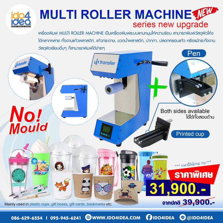 เครื่องพิมพ์แก้วพลาสติก แก้วกระดาษปลอกครอบแก้ว Multi Roller Machine เครื่องพิมพ์ระบบแกนหมุนให้ความร้อน สามารถพิมพ์วัสดุผิวโค้งได้หลากหลาย แก้วพลาสติก, แก้วกระดาษ, แก้วสแตนเลส , ขวดน้ำพลาสติก, ลูกกอล์ฟ, ปากกา วัสดุผิวแนวเรียบ