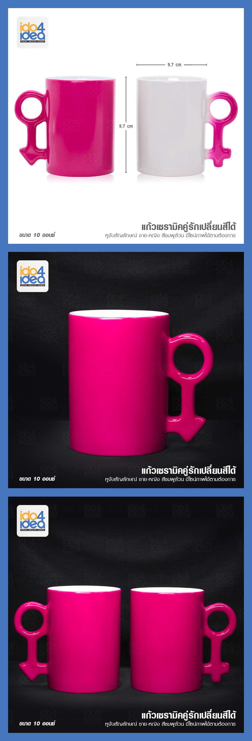 แก้วเซรามิคคู่รัก (หูจับชาย-หญิง) สีชมพูเปลี่ยนสี สำหรับพิมพ์สกรีนทรานเฟอร์, แก้วSublimation, แก้วสำหรับสกรีน พิมพ์ภาพได้