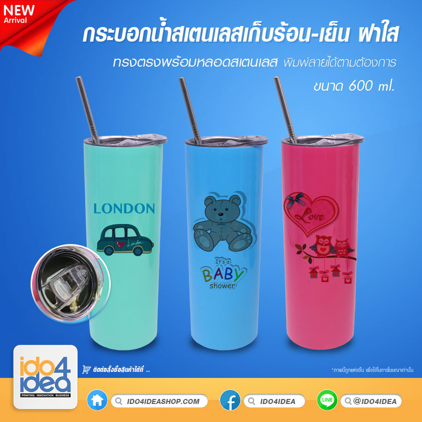 [2021BSKHIG] กระบอกน้ำสเตนเลสเก็บร้อน-เย็น ทรงตรงพร้อมหลอดสเตนเลส ฝาใส ขนาด 600 ml. มี 3 สี ให้เลือก