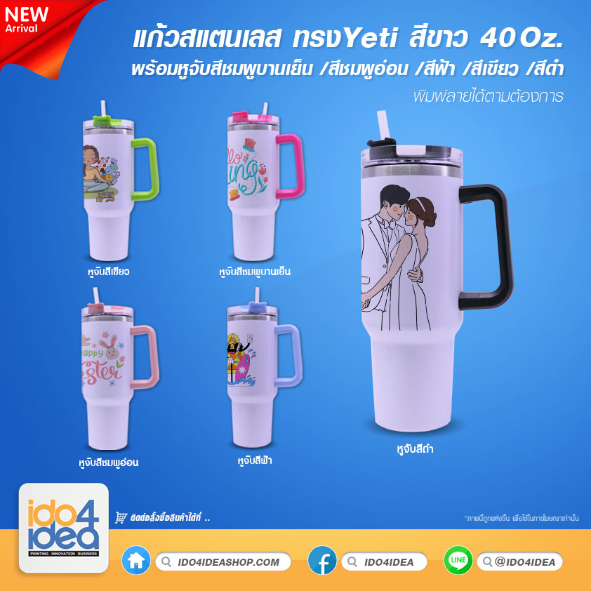 [PKSLYT30-WT-HDP] แก้วสแตนเลส ทรง Yeti 40 Oz. สีขาว พร้อมหูจับสี มี 5 สี ให้เลือก
