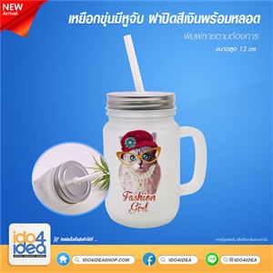 [2021MAJF] เหยือกขุ่นมีหูจับ ฝาปิดสีเงินพร้อมหลอด สูง 13 ซม. (Mason jar Frost)