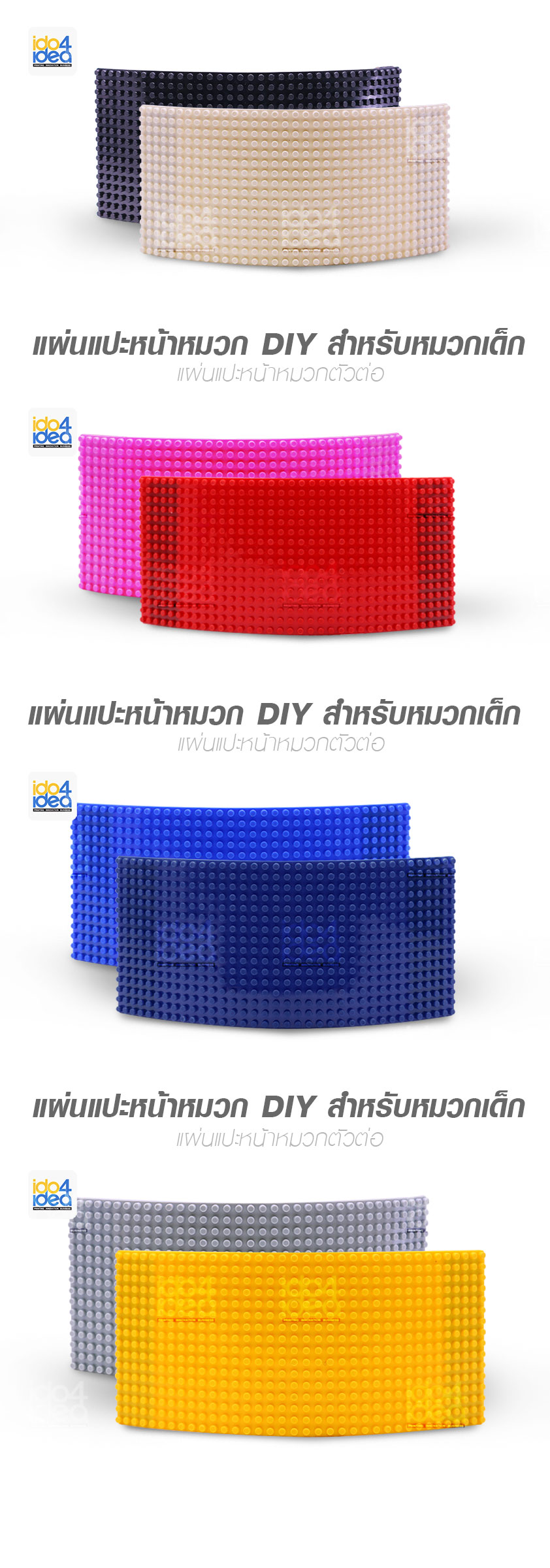 สามารถต่อตัวต่อเป็นรูปต่างๆ สีต่างๆ ได้บนแผ่นแปะหน้าหมวก