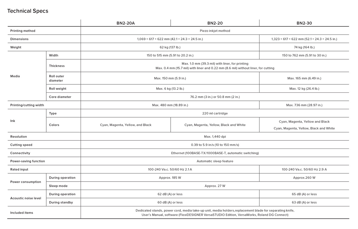 สเปคเด่นของ เครื่องพิมพ์และตัด Roland BN2 Series