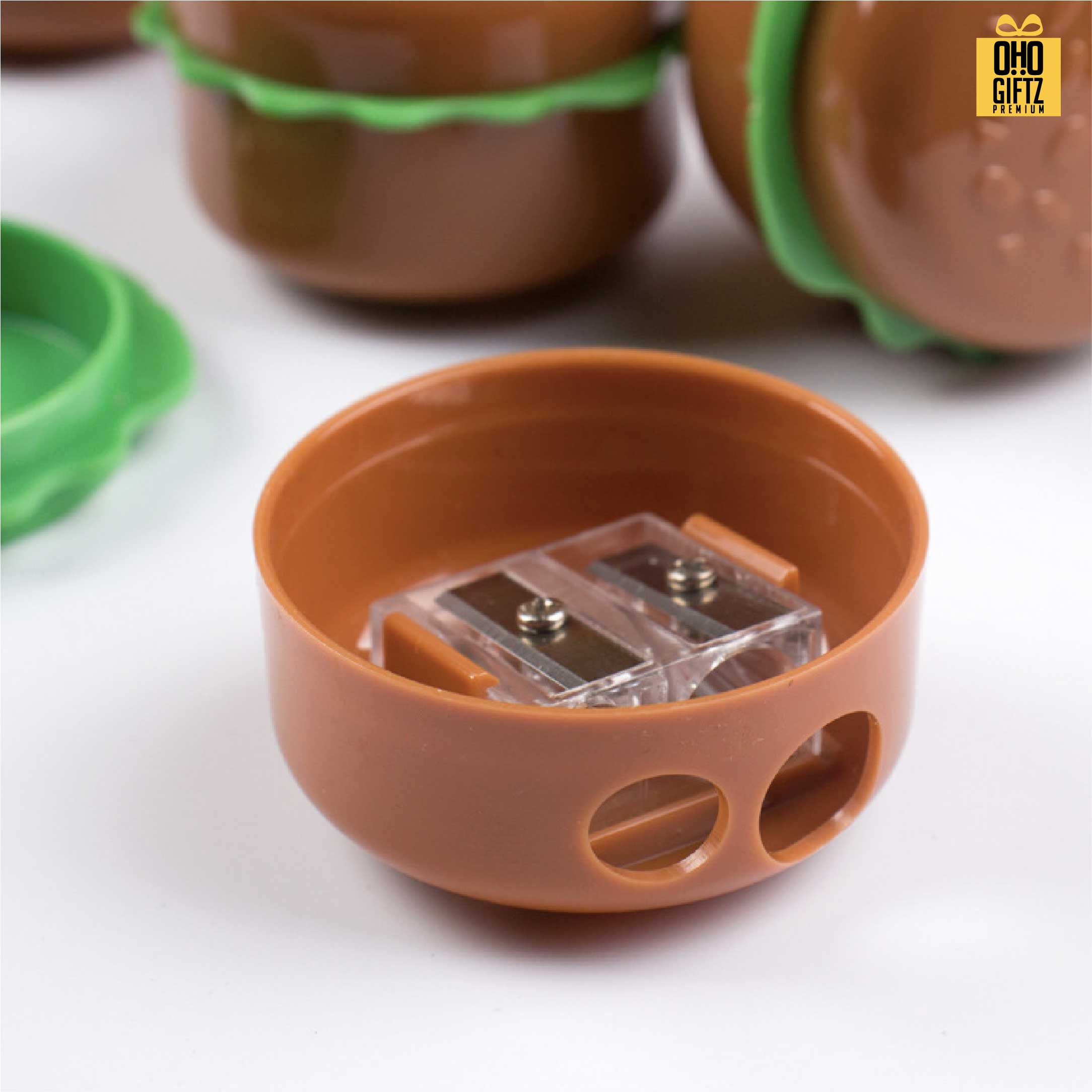 กบเหลาดินสอแฮมเบอร์เกอร์ ช่องเหลาคู่ สกรีนโลโก้ ทำของพรีเมี่ยมได้ (ขั้นต่ำ 100 ชิ้น)