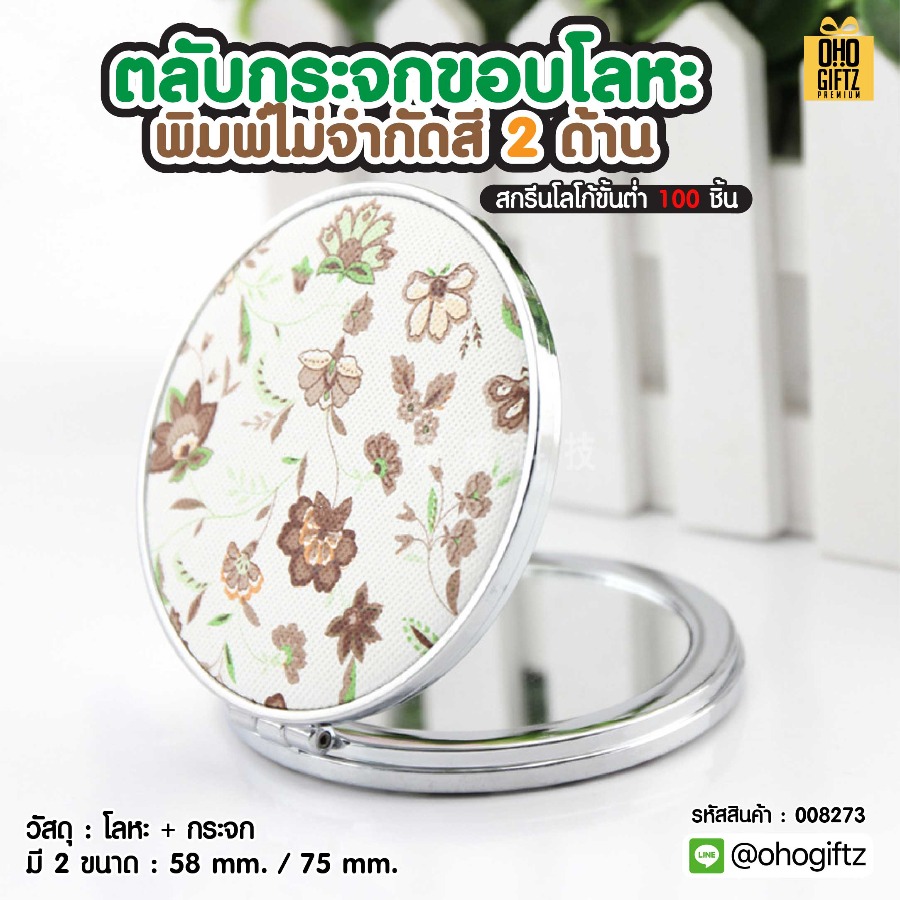ตลับกระจกขอบโลหะ พิมพ์ไม่จำกัดสี 2 ด้าน สกรีนโลโก้ ทำเป็นของพรีเมี่ยมได้