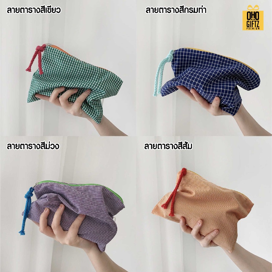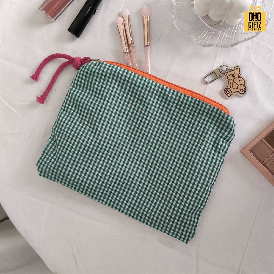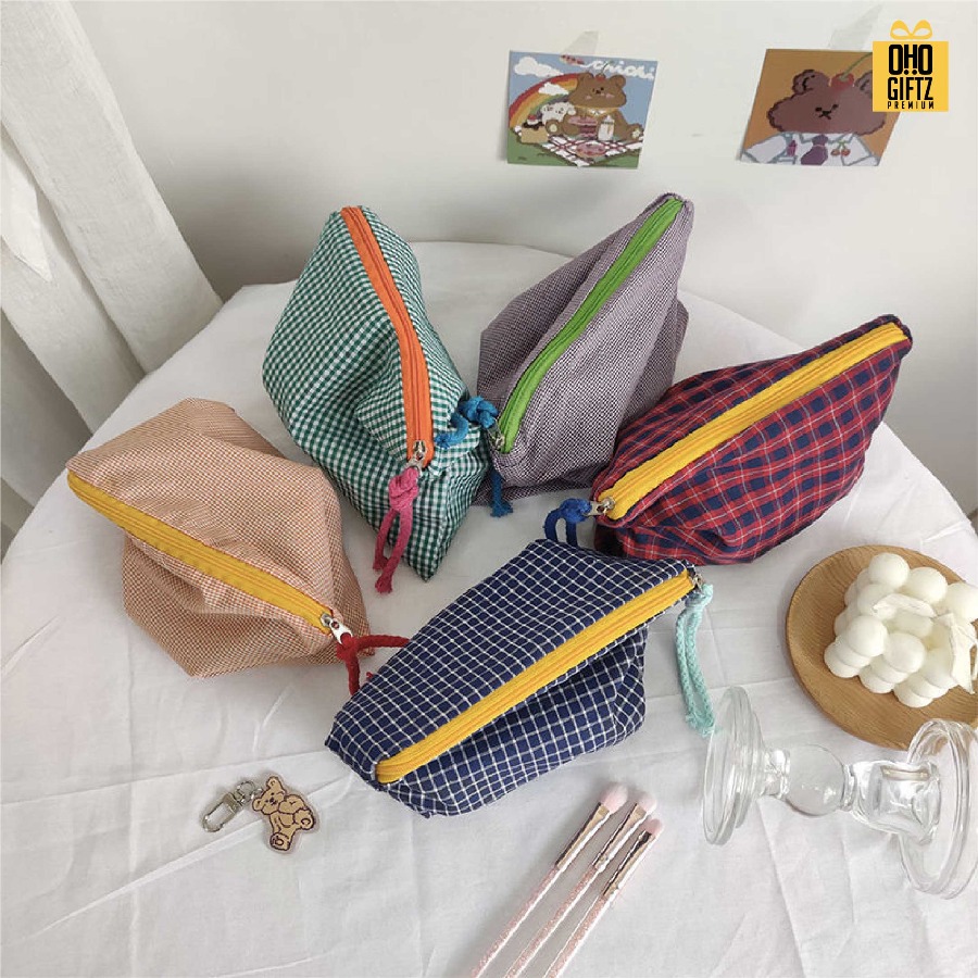กระเป๋าผ้าใส่เครื่องสำอางลายสก็อต ดีไซน์มินิมอล สามารถบรรจุเครื่องสำอาง ผลิตจากวัสดุคุณภาพดี ใส่สิ่งของได้สะดวกปากกระเป๋ากว้าง เหมาะกับยามเดินทาง หรือพกพาออกนอกสถานที่
