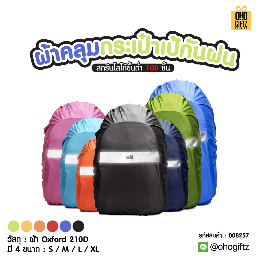 ผ้าคลุมกระเป๋าเป้กันฝน สกรีนชื่อ สกรีนโลโก้ ทำเป็นของพรีเมี่ยมได้