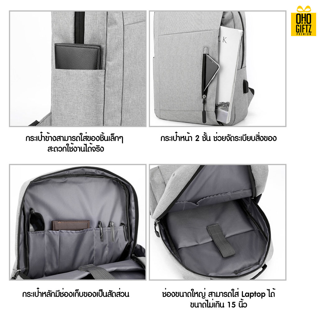 กระเป๋าเป้สะพายหลังมีช่องต่อ USB ดีไซน์เรียบง่าย กระเป๋าสามารถใส่ของใช้ใน ชีวิตประจำวันเช่น แล็ปท็อป เอกสารได้ สายชาร์จต่างๆ