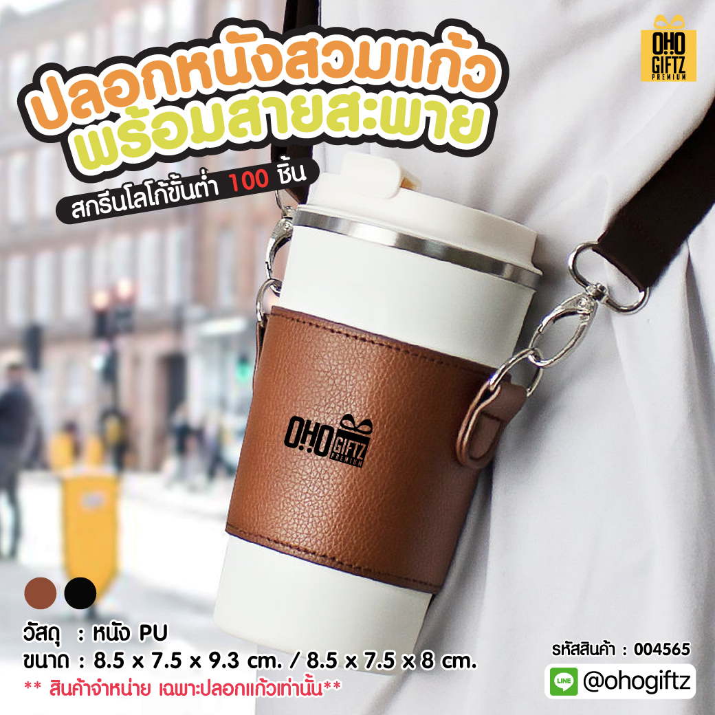 ปลอกหนังสวมแก้ว พร้อมสายสะพาย สกรีนโลโก้ ทำเป็นของพรีเมี่ยมได้