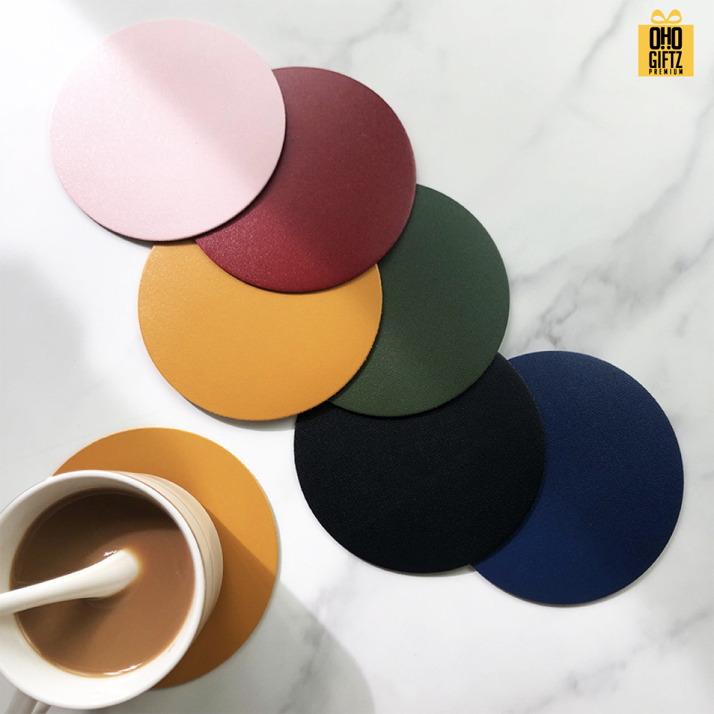 ที่รองแก้วน้ำทรงกลม PU ดีไซน์เก๋ไก๋ สีสันสดใส ใช้รองแก้วเพื่อกันลื่น หรือใช้เพื่อสร้างสีสันตกแต่งบนโต๊ะอาหาร ช่วยปกป้องพื้นผิวของโต๊ะจากรอยกระแทก น้ำหนักเบา