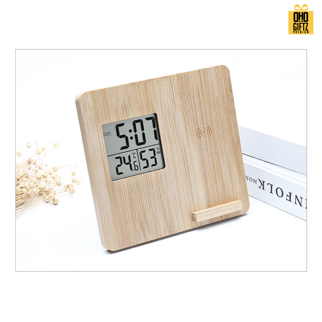 นาฬิกาไม้พร้อมที่ชาร์จมือถือไร้สาย บอกอุณหภูมิอากาศด้วย สกรีนชื่อ สกรีนโลโก้ ทำเป็นของพรีเมี่ยมได้ (ขั้นต่ำ 100 ชิ้น)