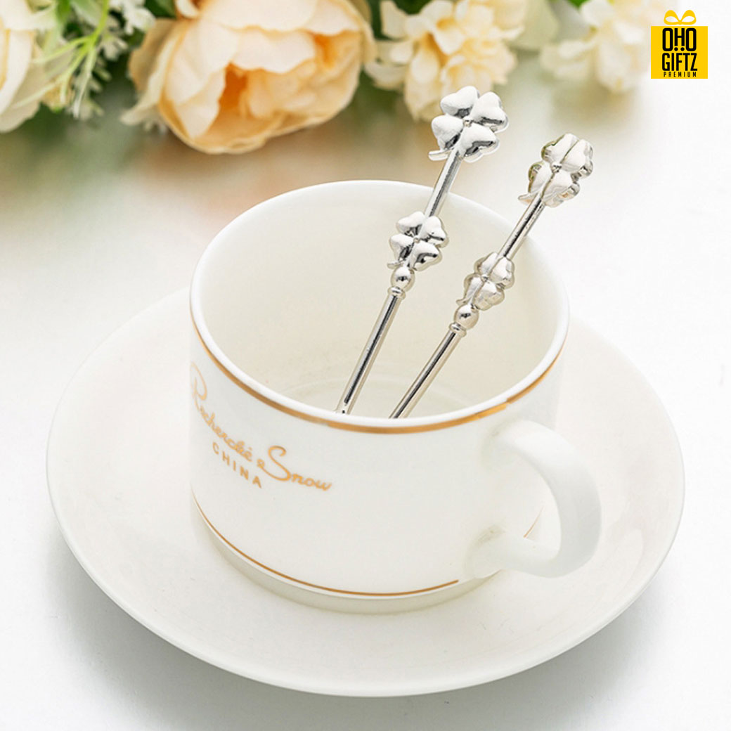 เซตช้อนกาแฟรูปใบโคลเวอร์ พิมพ์สติกเกอร์ชื่อฟรี ทำเป็นของพรีเมี่ยม ของชำร่วยงานเเต่งงานได้