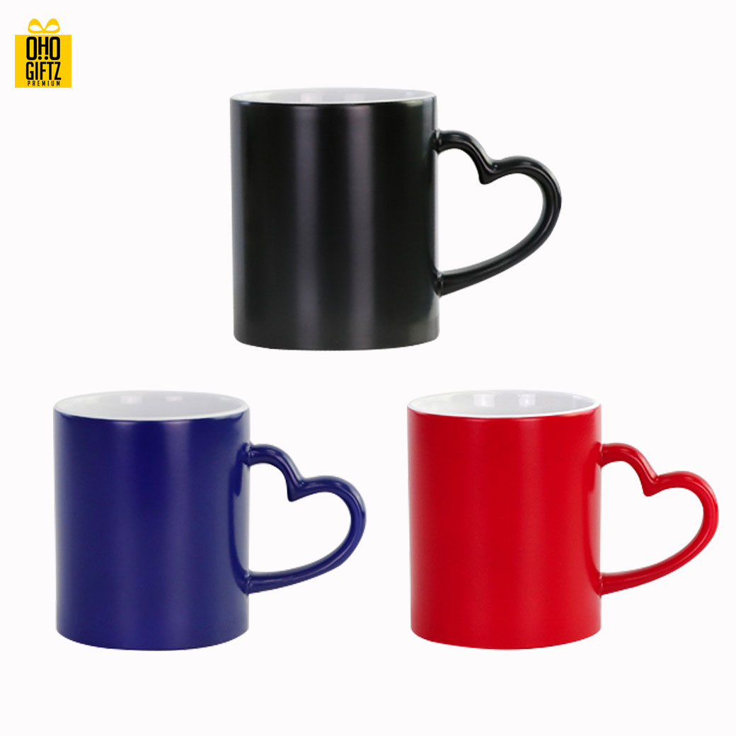 แก้วเซรามิค หูจับหัวใจ เนื้อเงา เปลี่ยนสีเมื่อใส่น้ำร้อน *ไม่มีขั้นต่ำ* สกรีนชื่อ สกรีนโลโก้ ใบเดียวก็ทำได้