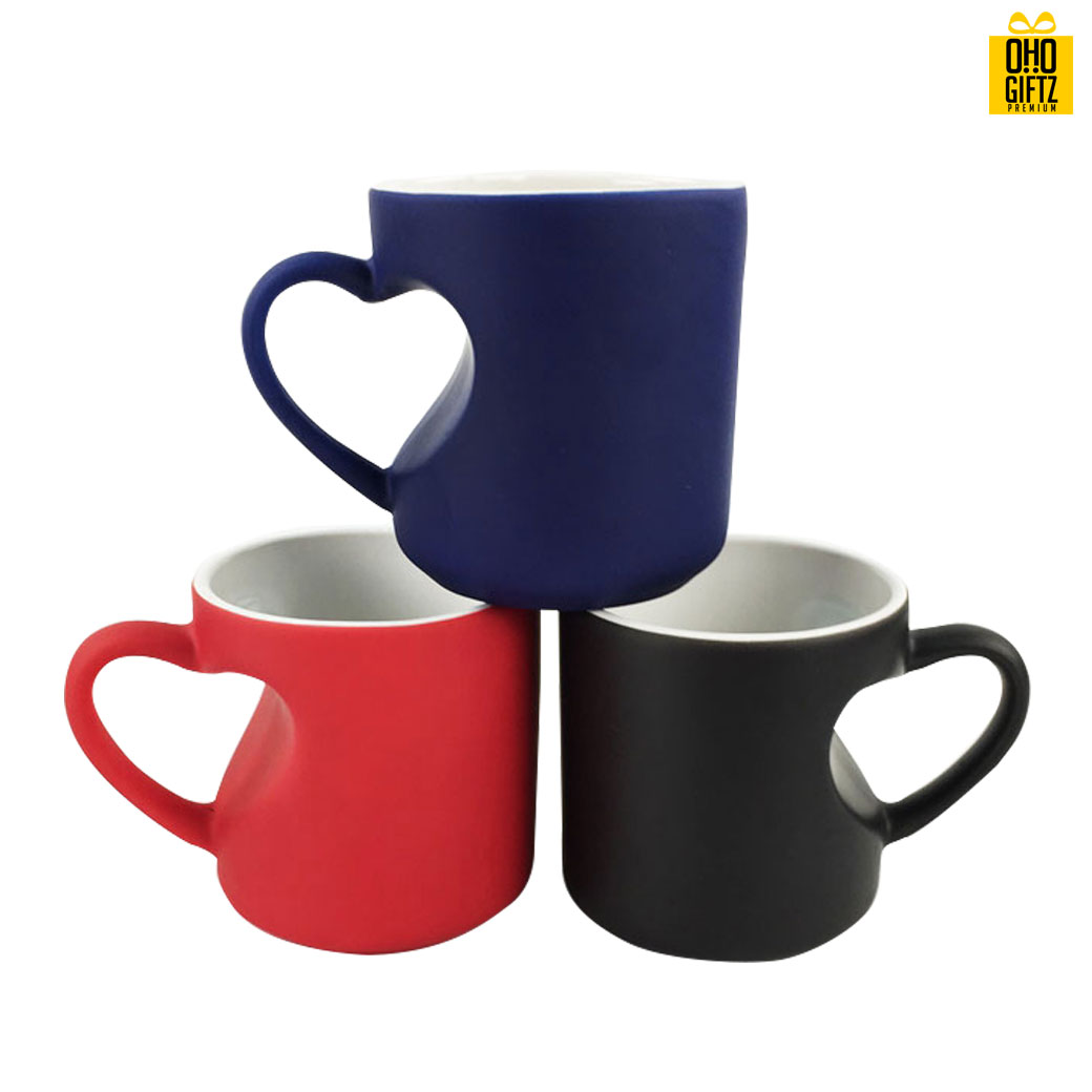 แก้วเซรามิค หูเว้าหัวใจ เนื้อด้าน เปลี่ยนสีเมื่อใส่น้ำร้อน *ไม่มีขั้นต่ำ* สกรีนชื่อ สกรีนโลโก้ ใบเดียวก็ทำได้
