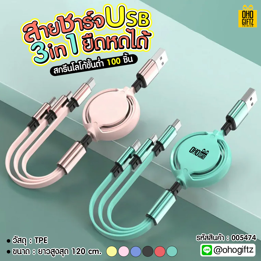 สายชาร์จ USB 3in1 ยืดหดได้ สกรีนชื่อ,โลโก้ ทำเป็นของพรีเมี่ยมได้
