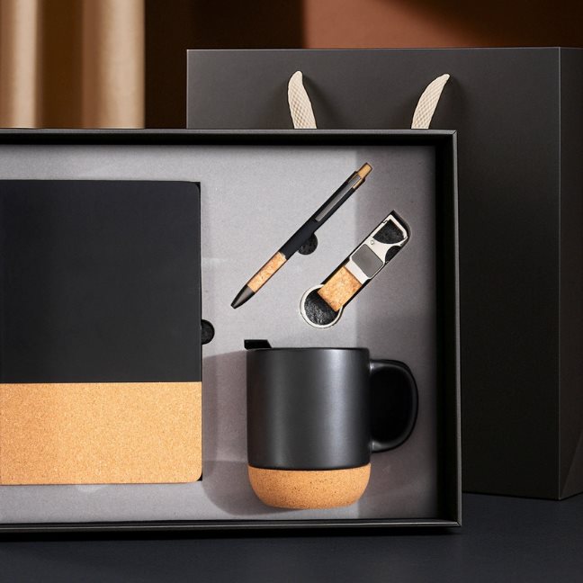 ชุดของขวัญที่ผสมผสานความเรียบหรูของโทนสีทันสมัยเข้ากับสัมผัสอันเป็นธรรมชาติของวัสดุไม้ก๊อกได้อย่างลงตัว ภายในเซ็ตประกอบไปด้วยไอเทมสำคัญสำหรับวัยทำงานอย่างครบครัน ทั้งสมุดโน้ต ปากกา พวงกุญแจ และแก้วมัคเซรามิก ซึ่งทั้งหมดถูกจัดวางมาอย่างประณีตในกล่องแพ็กเกจจิ้งและถุงกระดาษระดับพรีเมียม การเลือกมอบชุดของขวัญที่มีรูปลักษณ์โดดเด่นและแฝงกลิ่นอายความเป็นมิตรต่อสิ่งแวดล้อมเช่นนี้ จะช่วยสะท้อนภาพลักษณ์ขององค์กรผู้มอบให้ดูอบอุ่น เข้าถึงง่าย แต่ยังคงไว้ซึ่งความน่าเชื่อถือและความเป็นมืออาชีพ