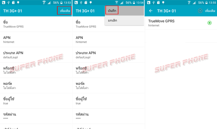- ช่องชื่อ ประเภท APN เลือก "default และ supl"